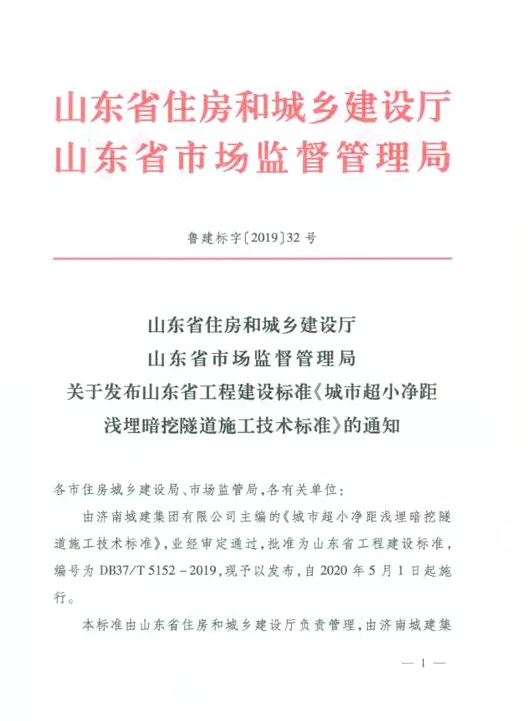 近日,山東省住房和城鄉(xiāng)建設廳與山東省市場監(jiān)督管理局聯合下發(fā)魯建標字[2019]32號文《關于發(fā)布山東省工程建設標準〈城市超小凈距淺埋暗挖隧道施工技術標準〉的通知》,宣布由城建集團主編的該標準業(yè)經審定通過,批準為山東省工程建設標準,編號為DB37/T 5152-2019,予以發(fā)布,自2020年5月1日起施行。這是城建集團主編并已發(fā)布的第九部山東省工程建設標準,對省內隧道施工起到了一定的規(guī)范指導作用。