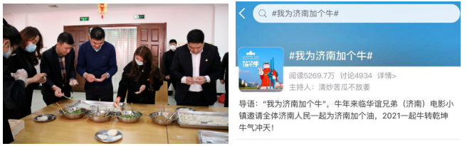 2021春節(jié)期間,華誼兄弟(濟(jì)南)電影城投資開發(fā)有限公司開展了年終總結(jié)表彰會(huì)、包餃子迎新年、我為濟(jì)南加個(gè)牛等一系列新春活動(dòng),喜迎牛年新春佳節(jié)的到來(lái),營(yíng)造了喜慶祥和的節(jié)日氛圍。