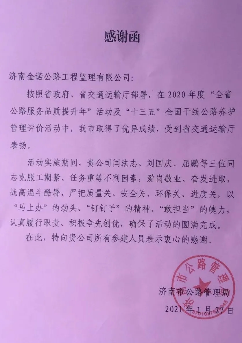 近日,濟南市公路管理局向金諾公司發(fā)來了《感謝函》,向金諾公司所有參建人員在2020年度“全省公路服務品質提升年”活動及“十三五”全國干線公路養(yǎng)護管理評價活動中,認真履行職責、積極爭先創(chuàng)優(yōu)的工作作風表示感謝。