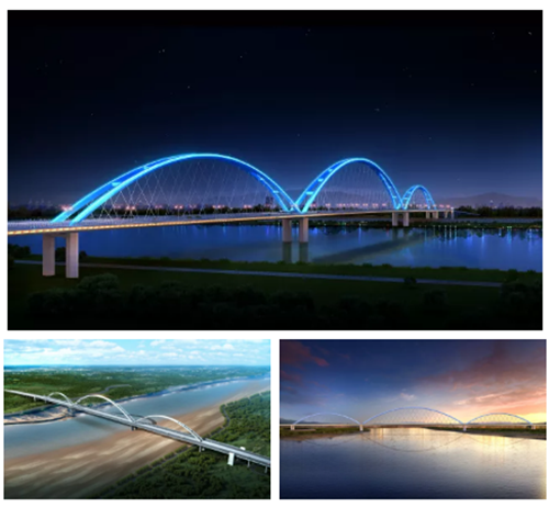兩座大橋都采用了公軌合建、同層布置的橋梁形式,該形式可集約利用過(guò)河通道資源,降低工程規(guī)模,節(jié)省工程投資,拱肋從主梁橋面公路交通與軌道交通之間穿過(guò),兼顧景觀效果及行車(chē)安全。