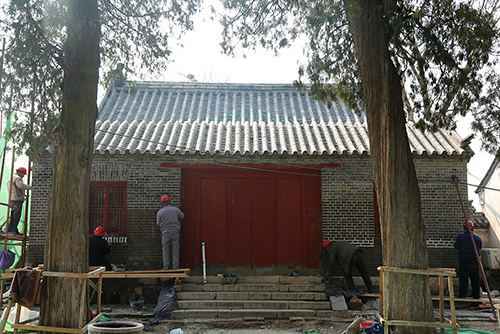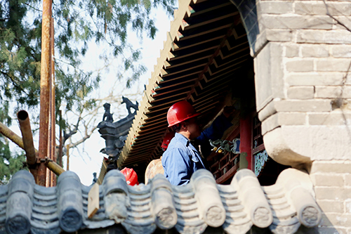 在現(xiàn)場可以看到,冬季過后,“修煉內(nèi)功”的綜合管線敷設(shè)、地形塑造、受損的磚作石作木作基底清理工作已基本完成,“濕作業(yè)”階段已經(jīng)全面展開。目前正在進(jìn)行中的主要工作為建筑屋面的修繕,建筑墻體的修補,路面、石階、古磚的清理修復(fù),建筑木構(gòu)件的砍活與重新上漆,木構(gòu)件表面彩繪的清理除塵等工作。
