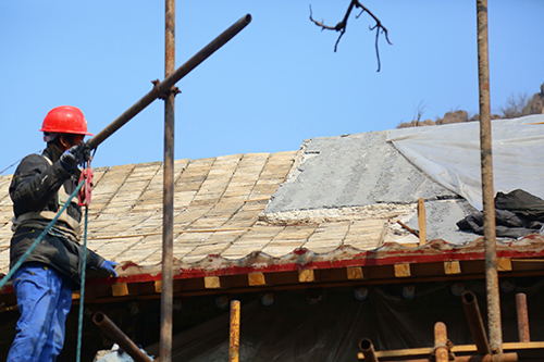 古法之一,苫背。苫(shàn)背,指蓋房子時在草席等上面抹上灰和泥土做成房頂?shù)蛯樱梢杂行Х乐刮菝媛┧I槐呈侨A陽宮修繕的重點工作之一,先上一層厚度約2公分的護(hù)板灰,再上一層厚度約6公分的麥秸灰,最后上一層厚度約2公分白灰與麻道灰的混合灰。苫背工作完成后,可以進(jìn)行下一步屋面瓦件鋪設(shè)。在苫背過程中,只拆除更換已損壞的灰層,仍然保留可以繼續(xù)使用的古灰層。