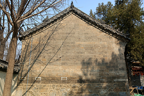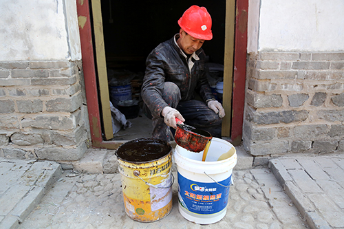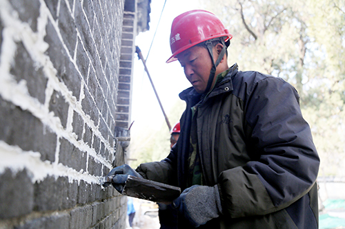 古法之三,磚藥與青磚白灰。在華陽宮內(nèi)的古建墻壁上,很多磚塊因為年代久遠(yuǎn)及腐蝕原因,有不同程度的破損,對墻面破損較輕微的磚塊,以修復(fù)方式,不作替換,具體用水泥、松煙與磚沫制成與墻面顏色一致的磚藥,用磨平與壓死的方式修補,還原磚塊原樣。在墻面修補方面,采用青磚白條灰勾縫進(jìn)行處理,恢復(fù)古建筑外貌。據(jù)了解,一位技術(shù)工人一天約能完成高度約50公分的青磚白條灰勾縫修補工作。
