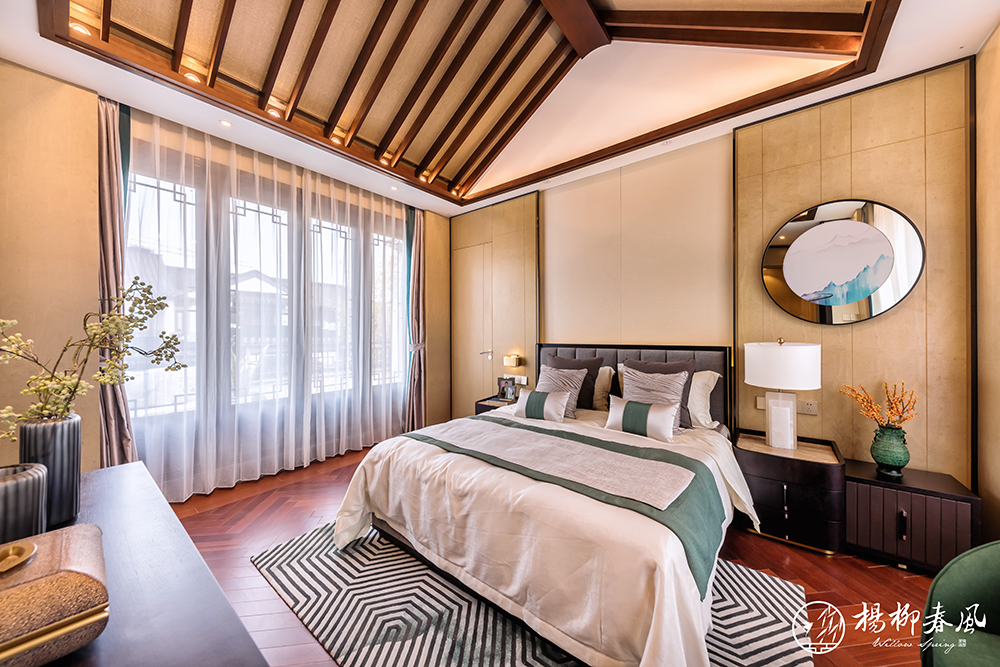 另一套大戶型樣板房采用新中式風(fēng)格,以儒家思想為依托,通過大理石、金屬銅、木材的有機(jī)結(jié)合,體現(xiàn)主人的穩(wěn)重、尊貴和優(yōu)雅。約110㎡的大面積庭院,演繹著四季不落幕的錦繡風(fēng)光;挑高約5.7米的地下空間,讓格調(diào)生活隨心定制。整套樣板房抒寫著文雅靈動(dòng)的東方氣韻,展現(xiàn)了“中正和雅”的國風(fēng)意境。