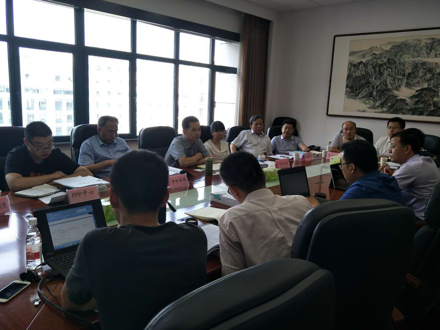 圖一、市城鄉(xiāng)水務(wù)局副巡視員朱丹彤、排水處處長湯啟剛、市財政、物價、環(huán)保局等有關(guān)單位與公司總經(jīng)理李少成一同與社會資本預(yù)中標(biāo)人談判。