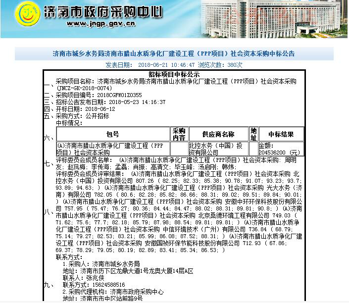 2018年6月14日-22日,按照市城鄉(xiāng)水務(wù)局要求,資產(chǎn)運營公司參加臘山水質(zhì)凈化廠ppp項目預(yù)中標(biāo)社會資本談判會,按照政府采購中心要求與前三名中標(biāo)人進(jìn)行會談,按程序最終確定成績第一名的北控水務(wù)(中國)投資有限公司中標(biāo)。21日濟南市政府采購中心開始進(jìn)行中標(biāo)公示,22日資產(chǎn)運營召專題研究會,與北控水務(wù)就合作協(xié)議、公司章程相關(guān)內(nèi)容與條款進(jìn)行討論,研究部署組建ppp公司相關(guān)工作,倒排工期,壓茬推進(jìn)各項前期工作。