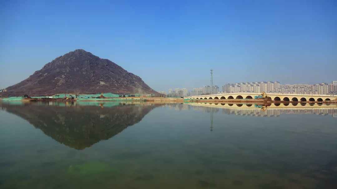 “兩水夾明鏡,雙橋落彩虹”,在華山南側(cè)和東側(cè),未來將有兩座橋梁與陸地相連。在現(xiàn)場看到,位于華山南側(cè)的崇正橋(原“鵲華橋”,因在華山腳下挖出崇正碑,上有嘉慶年間重修崇正橋碑記記載,故擬名“崇正橋”)為三孔橋型,是整個(gè)公園中最重要的一座橋,串聯(lián)湖南岸的歷史文化區(qū)和華陽宮,崇正橋全長95米、寬17米。目前正在進(jìn)行橋梁四個(gè)亭子的主體澆筑及橋面鋪裝施工,計(jì)劃3月底完成全部施工任務(wù)。