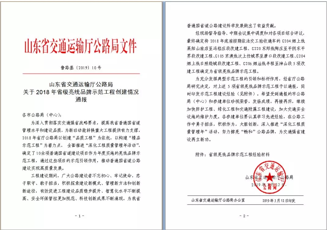 由濟(jì)南城市建設(shè)集團(tuán)所屬金諾公司負(fù)責(zé)代建管理、金衢公司負(fù)責(zé)設(shè)計(jì)、金曰等公司參與建設(shè)的G220東鄭線(xiàn)陶莊至平陰東平界段改建工程(簡(jiǎn)稱(chēng)“G220平陰南段改建工程”)喜獲山東省交通運(yùn)輸廳公路局“2018年省級(jí)亮線(xiàn)品牌示范工程”榮譽(yù)稱(chēng)號(hào)。