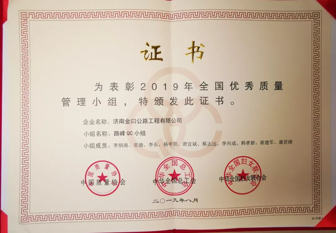 近日,在2019年全國交通質(zhì)量年會上,濟南金曰公路工程有限公司再次獲得“全國優(yōu)秀質(zhì)量管理小組”稱號。這是金曰公司連續(xù)第九年獲得該榮譽稱號。