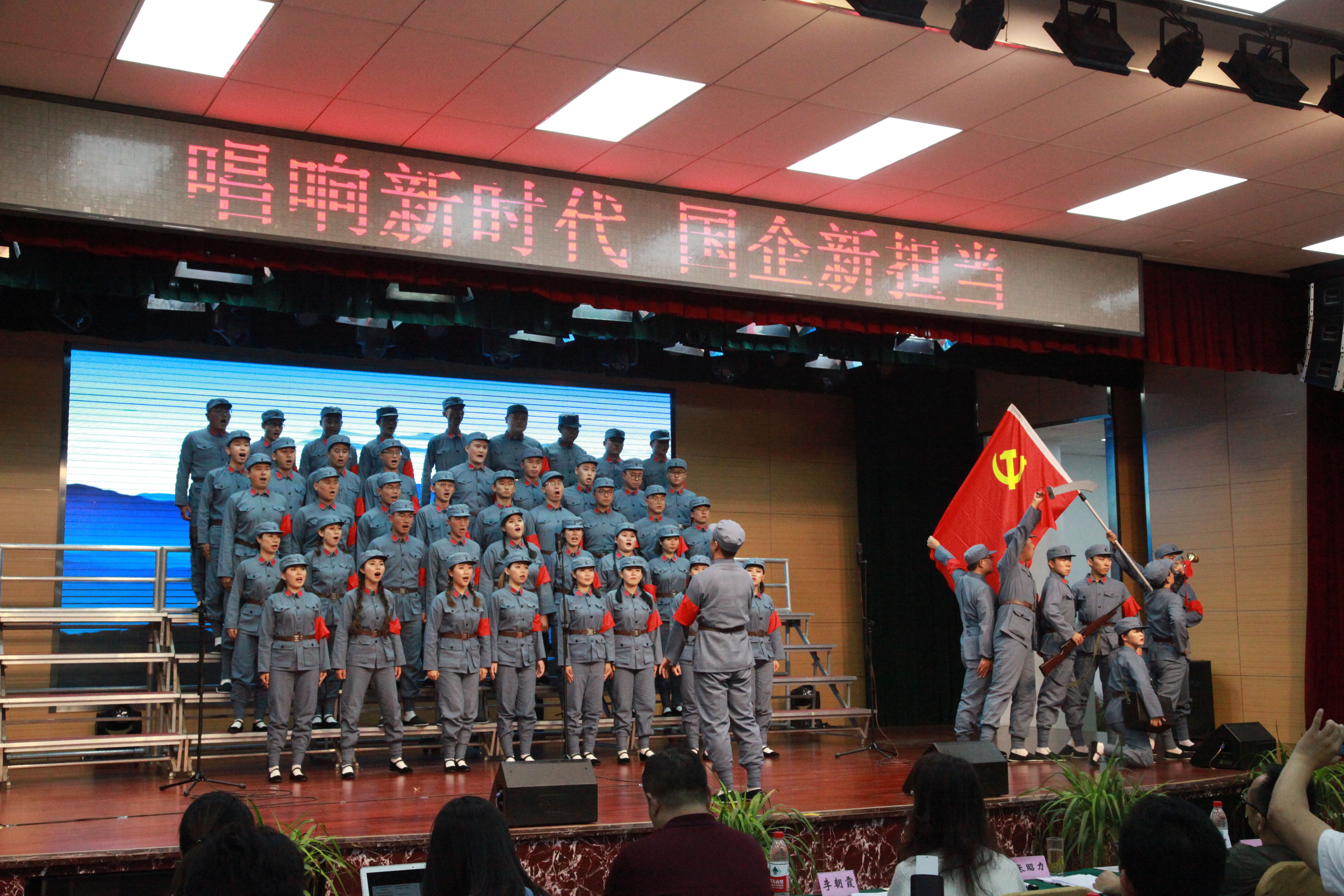 紅歌會(huì)活動(dòng)現(xiàn)場(chǎng),《鼓浪嶼之波》《歌唱祖國(guó)》《山丹丹開花紅艷艷》《我愛你中國(guó)》《我和我的祖國(guó)》《祖國(guó)不會(huì)忘記》《天耀中華》等十七首經(jīng)典愛國(guó)歌曲輪番上演,歌聲在會(huì)場(chǎng)上空飄蕩。集團(tuán)公司現(xiàn)場(chǎng)合唱的是紅色經(jīng)典歌曲《在太行山上》。歌曲由三個(gè)部分組成。第一部分為詩歌朗誦。表達(dá)了抗戰(zhàn)時(shí)期中國(guó)軍民艱苦卓絕的奮斗歷程和大無畏的革命樂觀精神;第二部分為情景表演。描繪了八路軍戰(zhàn)士們?cè)趹?zhàn)場(chǎng)上揮舞著紅色旗幟,在沖鋒的號(hào)聲中,向敵人的陣地發(fā)起沖鋒,受傷的戰(zhàn)士在衛(wèi)生員和戰(zhàn)友的攙扶下在戰(zhàn)場(chǎng)上繼續(xù)前進(jìn)的場(chǎng)景。第三部分為歌曲合唱。演員們身著八路軍軍裝,精神抖擻,情緒高昂,歌聲嘹亮,仿佛把大家?guī)肓藨?zhàn)火紛飛的年代,給人以催人奮進(jìn),所向披靡的力量,兩個(gè)聲部相互配合,高低呼應(yīng),逐步將歌曲推向高潮。