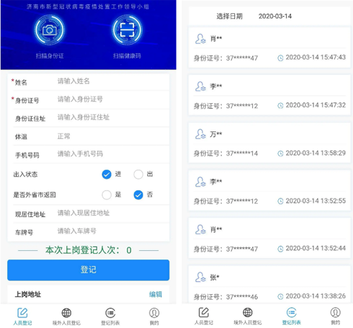 為切實(shí)保障濟(jì)陽區(qū)濟(jì)陽、濟(jì)北11個(gè)社區(qū)居民的生命安全和身體健康,上崗前,每名志愿者都在手機(jī)上安裝了“濟(jì)南易通行”APP,利用高科技軟件對社區(qū)居民每天的進(jìn)出狀況做好登記,既方便又快捷。