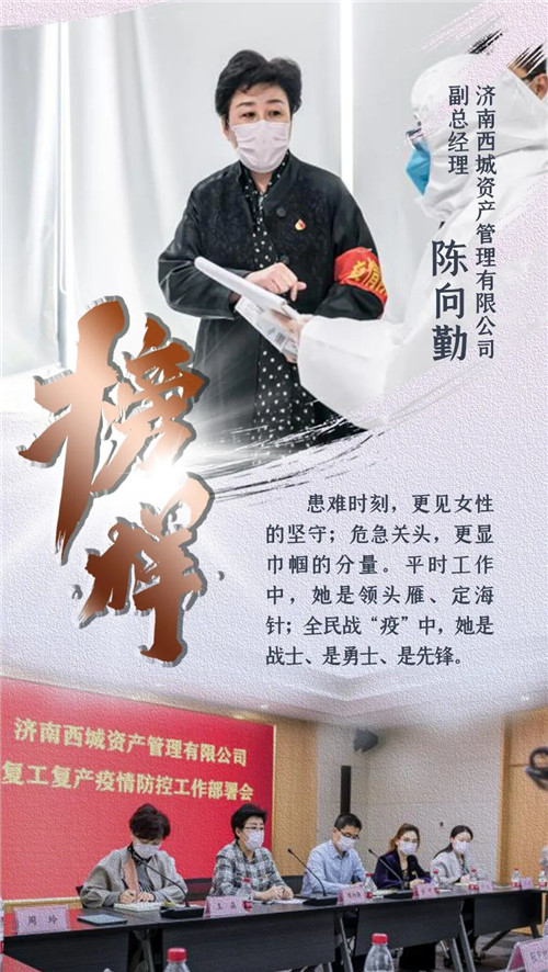 患難時刻,更見女性的堅守;危急關(guān)頭,更顯巾幗的分量。平時工作中,她是領(lǐng)頭雁、定海針;全民戰(zhàn)“疫”中,她是戰(zhàn)士、是勇士、是先鋒。作為200多萬平方國有資產(chǎn)的“守護者”,陳向勤一直堅守在資產(chǎn)管理一線,制定并落實防控預(yù)案及標準化操作,部署建立三級防控體系,為國有資產(chǎn)疫情防控樹立了新標桿。她帶動西城資產(chǎn)人同心戰(zhàn)“疫”,筑起一道守護國有資產(chǎn)安全的鋼鐵防線。