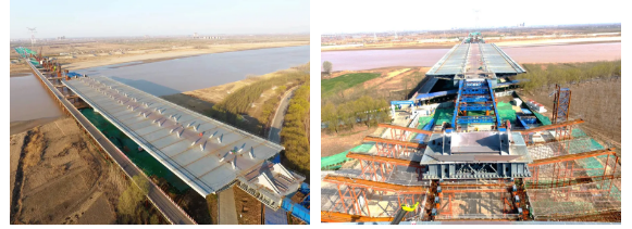 北岸280m跨鋼箱梁總拼完成,正在由南向北進(jìn)行頂推,累計(jì)前進(jìn)380米。