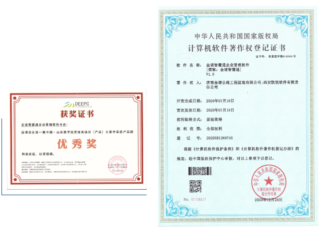 2020年,金諾公司與西安凱悅軟件有限責(zé)任公司合作,研發(fā)了“金諾智慧通”企業(yè)管理軟件,于2020年12月取得中國版權(quán)保護中心頒發(fā)的軟件著作權(quán)登記證書。“金諾智慧通”參加了第一屆中國(山東)數(shù)字經(jīng)濟優(yōu)秀項目(產(chǎn)品)大賽,并獲得產(chǎn)品組“優(yōu)秀獎”。同時,2020年下半年推動的針對公路工程建設(shè)開發(fā)的“路面三維剖面破損(病害)自動檢測系統(tǒng)”、“橋梁在線監(jiān)測系統(tǒng)”等8個軟件已申報軟件著作權(quán)登記,軟件著作權(quán)登記證書已于2021年3月份下發(fā)。