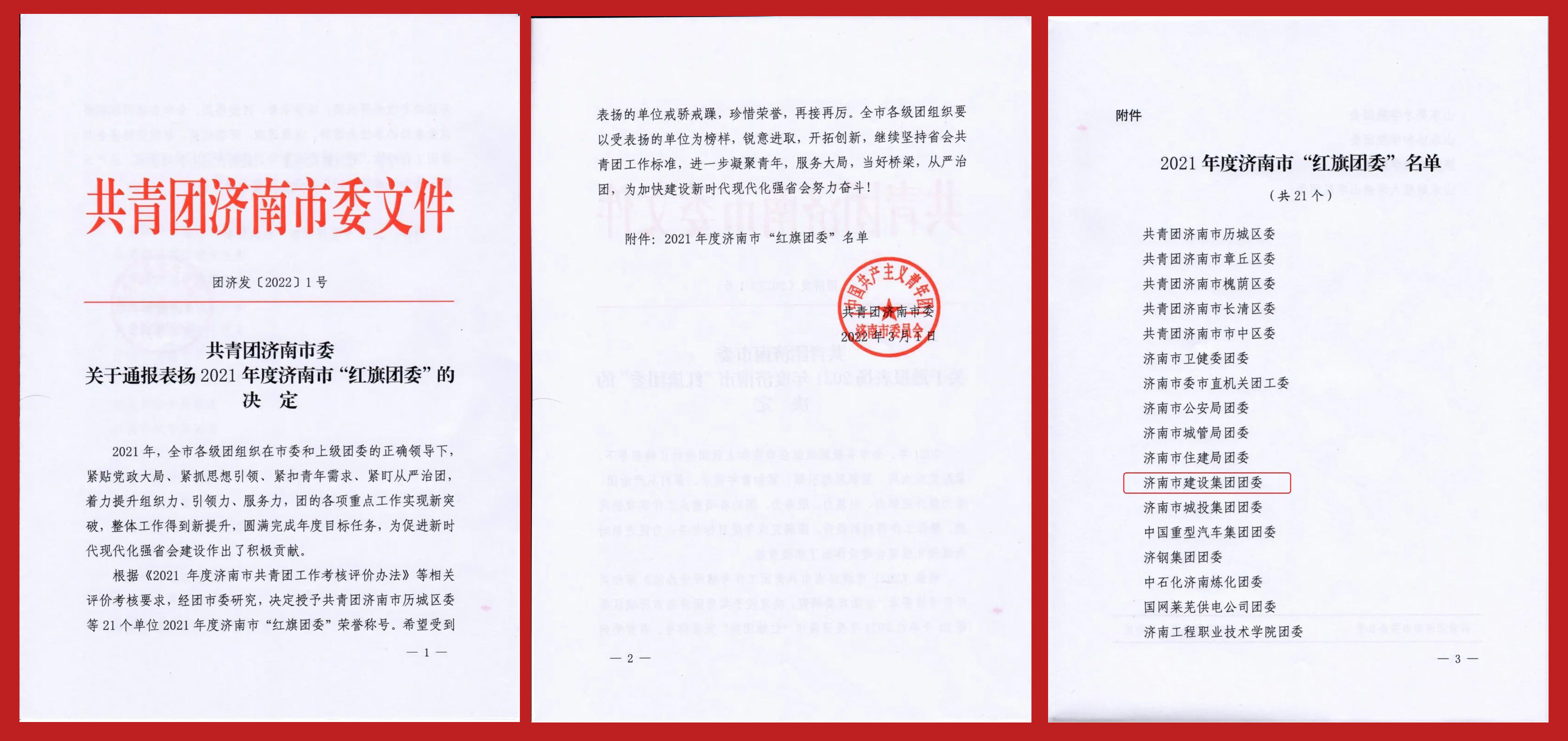 2022年3月1日,共青團濟南市十七屆四次全委(擴大)會議召開。會議通報了2021年度全市共青團工作綜合考核情況,建設集團團委被評為2021年度濟南市“紅旗團委”。共青團濟南市委向集團主要領導發(fā)來了《2021年建設集團團工作考核評價函》,并向集團對共青團工作的支持和關心表示了感謝。