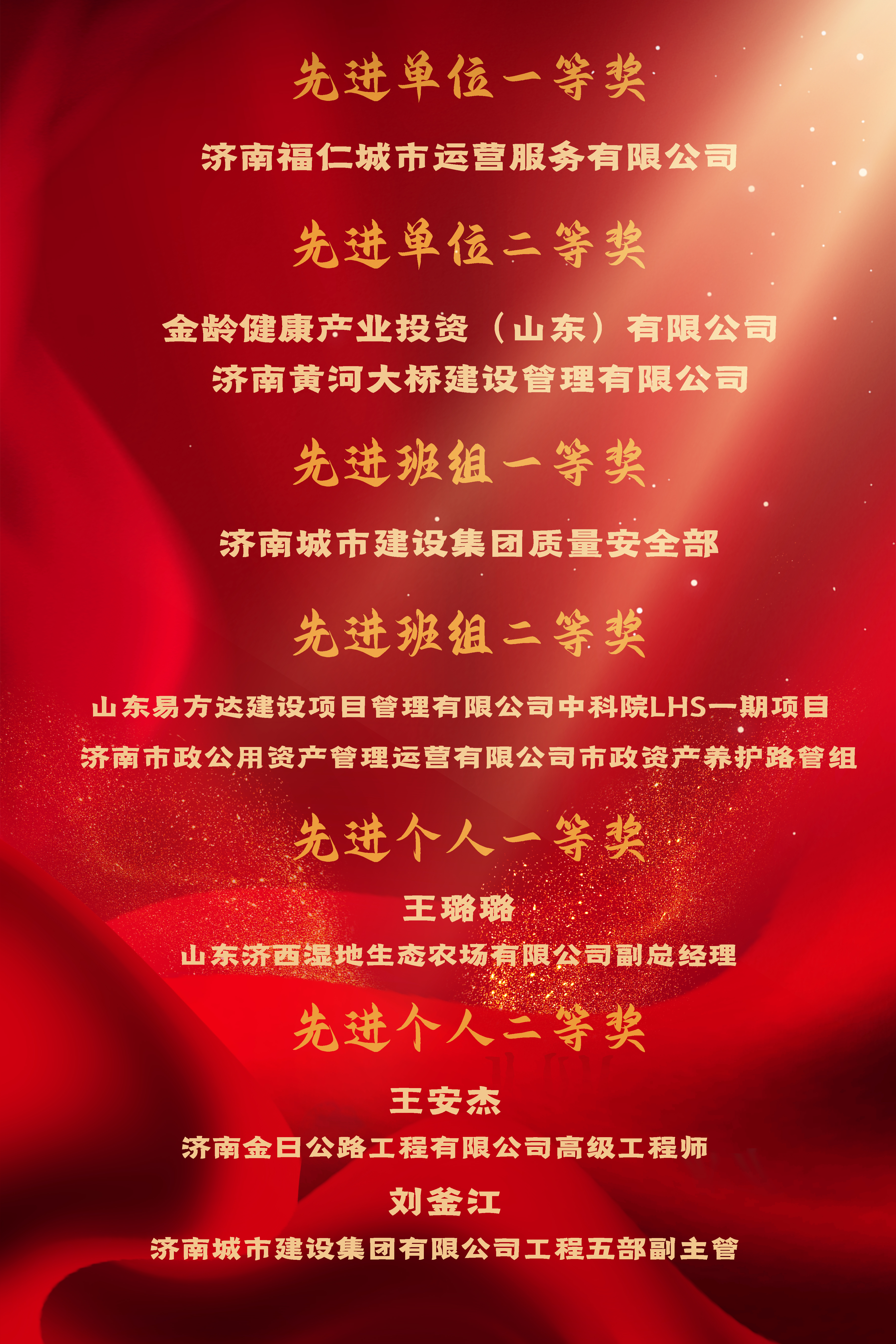 會(huì)上宣讀了《關(guān)于表?yè)P(yáng)2022年建設(shè)強(qiáng)省會(huì)勞動(dòng)競(jìng)賽先進(jìn)集體和先進(jìn)個(gè)人的通報(bào)》,獲得勞動(dòng)競(jìng)賽一等獎(jiǎng)的30個(gè)單位獲頒濟(jì)南市五一勞動(dòng)獎(jiǎng)狀、30個(gè)班組獲頒濟(jì)南市工人先鋒號(hào)、80名職工獲頒濟(jì)南市五一勞動(dòng)獎(jiǎng)?wù)隆F渲校ㄔO(shè)集團(tuán)3家公司獲先進(jìn)單位稱(chēng)號(hào),3個(gè)班組獲先進(jìn)班組稱(chēng)號(hào),3名同志獲先進(jìn)個(gè)人稱(chēng)號(hào)。