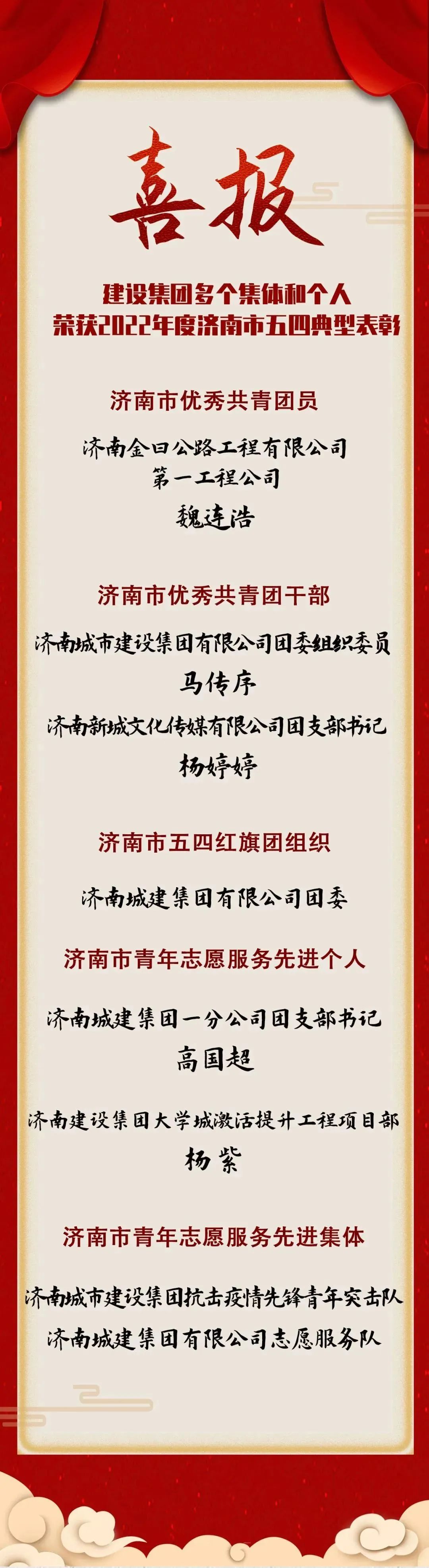 5月5日,共青團(tuán)濟(jì)南市委公布了《2022年度濟(jì)南市五四典型表揚(yáng)通報(bào)》,建設(shè)集團(tuán)團(tuán)委所屬團(tuán)組織及團(tuán)員青年榮獲“濟(jì)南市優(yōu)秀共青團(tuán)員”“濟(jì)南市優(yōu)秀共青團(tuán)干部”“濟(jì)南市五四紅旗團(tuán)組織”“濟(jì)南市青年志愿服務(wù)先進(jìn)個(gè)人”“濟(jì)南市青年志愿服務(wù)先進(jìn)集體”等5項(xiàng)榮譽(yù)稱號(hào)。