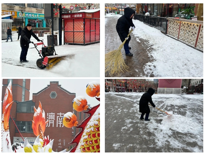 濟(jì)南泉世界商業(yè)管理有限公司召集物業(yè)團(tuán)隊(duì)提前對(duì)印象濟(jì)南·泉世界進(jìn)行緊急除雪應(yīng)對(duì)部署。根據(jù)特殊天氣情況在商戶群內(nèi)提前下發(fā)溫馨提示,提醒商家大雪天氣地面濕滑、注意出行安全,同時(shí)做好相關(guān)保障措施。公司督導(dǎo)物業(yè)公司提前對(duì)除雪設(shè)施設(shè)備進(jìn)行保養(yǎng),備好除雪物資。街區(qū)從凌晨開始對(duì)商戶門前、主干道及街區(qū)內(nèi)外部道路進(jìn)行清掃工作,借助掃雪機(jī)對(duì)主干道進(jìn)行大清工作,為商戶及游客開辟出暢通安全的道路。