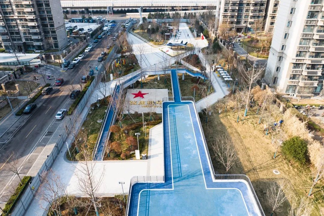 公園北區(qū)主要通過(guò)對(duì)飛機(jī)造型提取折線元素,結(jié)合不同的主題節(jié)點(diǎn)來(lái)營(yíng)造多維度的場(chǎng)景空間,參照原有機(jī)場(chǎng)航站樓造型設(shè)計(jì)的造型觀景廊橋,包括保留和利用張莊機(jī)場(chǎng)原有的水泥跑道地面進(jìn)行二次設(shè)計(jì),結(jié)合廊架、座椅、智能健身器械等設(shè)施,將張莊機(jī)場(chǎng)歷史文化融入景觀設(shè)計(jì),市民不僅能欣賞公園景色,還能在休閑娛樂(lè)中接受文化熏陶,感受軍民團(tuán)結(jié)一心的濃厚氛圍。