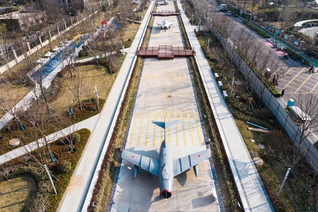 公園南區(qū)入口打造文化長(zhǎng)廊,通過(guò)展示中國(guó)戰(zhàn)機(jī)發(fā)展史讓市民了解空軍文化;結(jié)合原有170米長(zhǎng)水泥跑道,通過(guò)景觀手法進(jìn)行二次設(shè)計(jì),融合機(jī)場(chǎng)跑道符號(hào)、導(dǎo)航等設(shè)施還原機(jī)場(chǎng)跑道場(chǎng)景,沿跑道科普展示曾在張莊機(jī)場(chǎng)服役的戰(zhàn)機(jī)模型,進(jìn)行航空科普、國(guó)防軍事及愛(ài)國(guó)主義教育。