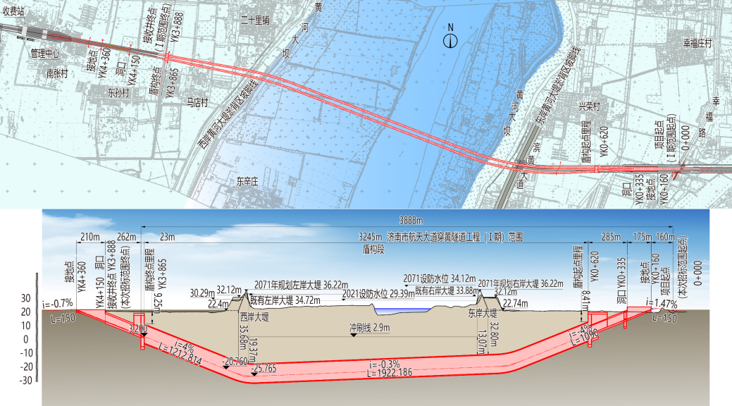 濟南市航天大道穿黃隧道工程(I期)項目東起高新區(qū)航天大道與X012交叉口,向西下穿黃河后止于西岸起步區(qū)馬店村,全長3888米,作為串聯(lián)黃河兩岸的骨干線,是山東省、濟南市重點項目,對提升省市形象、改善人居出行、搭建城北片區(qū)骨架路網(wǎng)起到重要的支撐帶動作用。