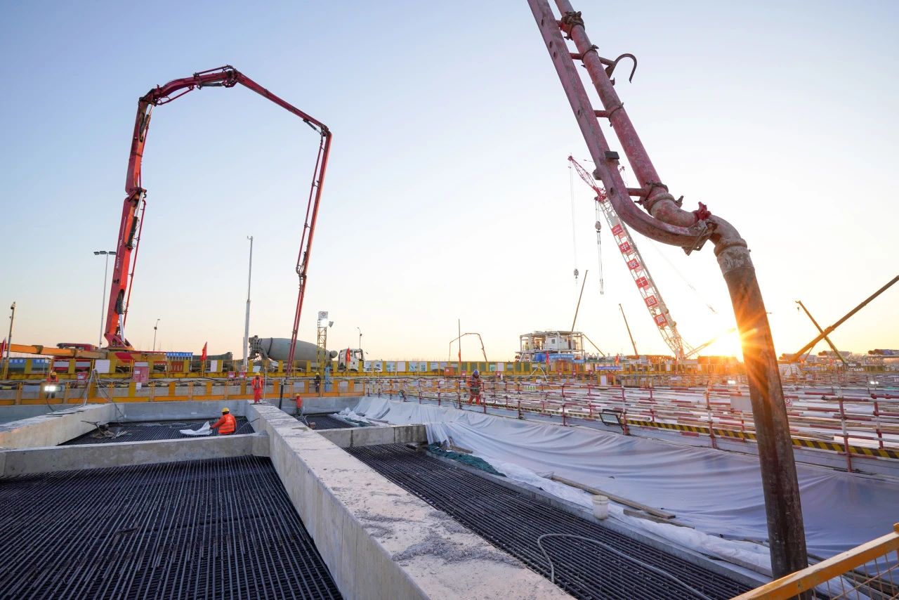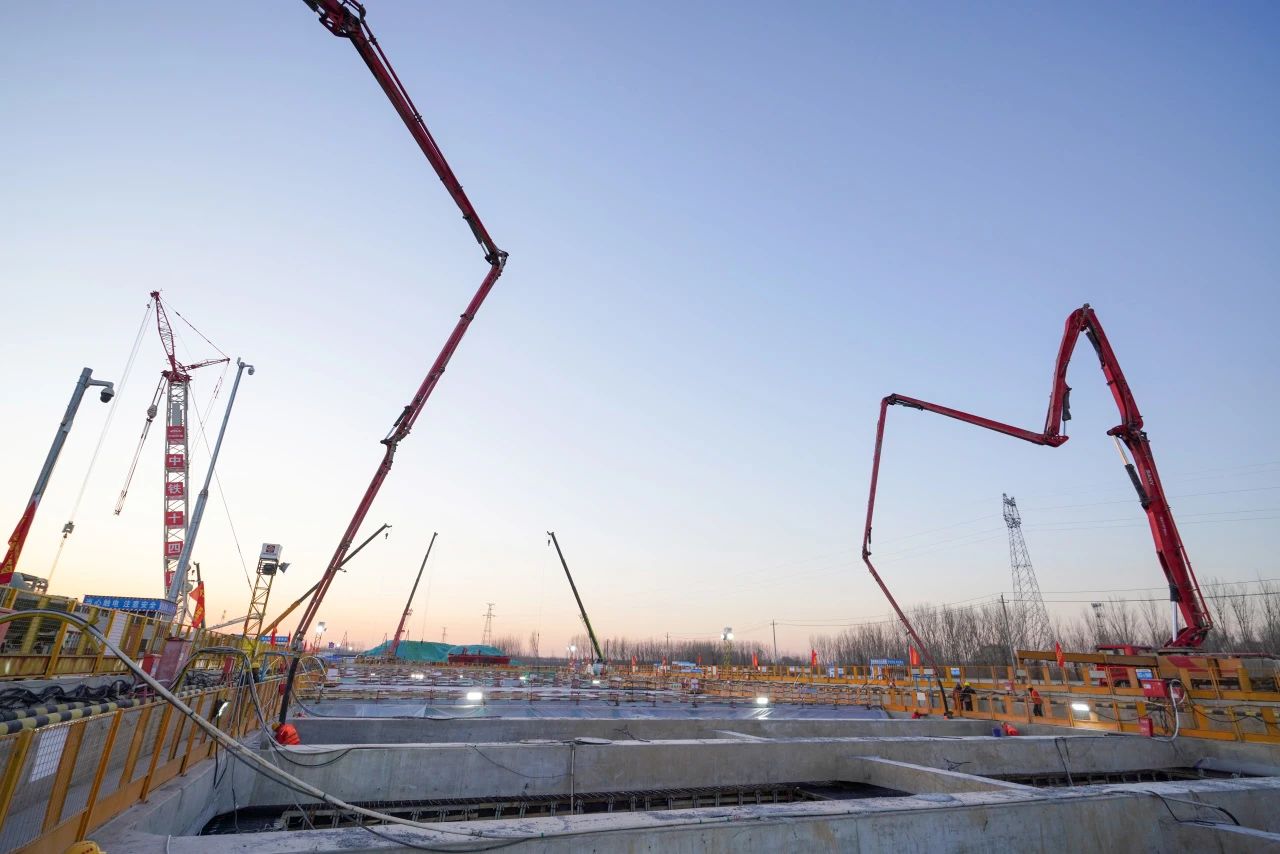 東岸主體結(jié)構(gòu)分為16個獨立倉段進行施工,鋼筋總量約9500噸,混凝土總方量約4.4萬方。主體結(jié)構(gòu)施工過程中面臨諸多挑戰(zhàn)與困難,施工過程中嚴格按照施工計劃,精心組織、科學(xué)管理,對16個獨立倉段合理劃分施工區(qū)域,依次展開作業(yè)。各施工班組緊密配合,確保鋼筋綁扎、模板安裝、混凝土澆筑等工序有序進行。2024年8月19日主體結(jié)構(gòu)正式開始施工,截至12月29日主體結(jié)構(gòu)完成整體封頂,比原計劃工期提前28天,為后續(xù)盾構(gòu)始發(fā)奠定了堅實的基礎(chǔ)。