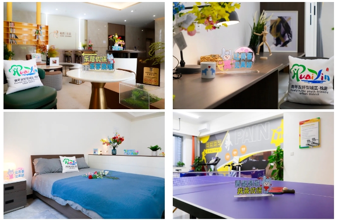 區(qū)別于普通出租公寓、酒店賓館,根據(jù)青年喜好,植入專屬LOGO 、IP形象等青春元素。房間內(nèi)部配備床、衣柜、書桌椅、置物架等,并有獨(dú)立衛(wèi)浴、冷暖供應(yīng),青年可“拎包入住”。公共區(qū)域整體打造自助辦公、學(xué)習(xí)閱讀、運(yùn)動(dòng)健身、共享會客、休閑娛樂、自助廚房6大功能區(qū),滿足青年日常需求。