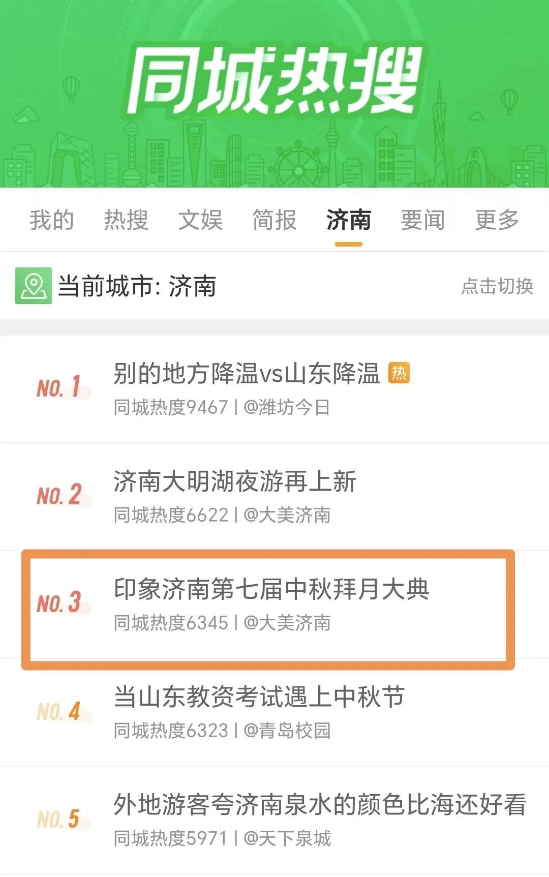 #印象濟(jì)南第七屆中秋拜月大典#作為微博熱搜話題,登錄同城熱搜榜第三位,閱讀量超25萬次。