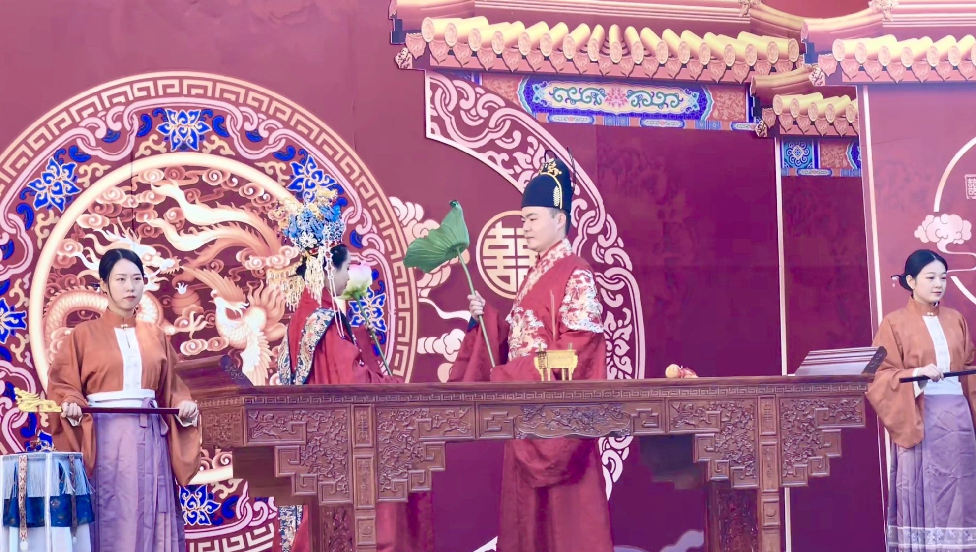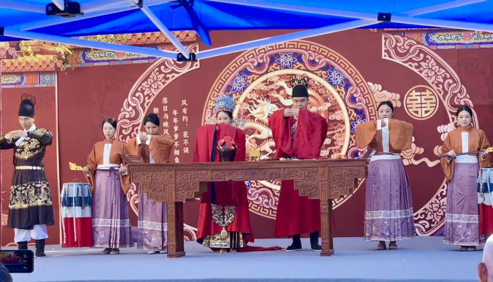 “山河月明”羅芙威宮中式婚禮展演,盛世華禮、古韻十足,演員們身著華彩衣裝,恍若穿越千古時(shí)光翩翩而來,在印象濟(jì)南·泉世界東門主街,帶領(lǐng)市民游客沉浸式體驗(yàn)中式婚禮的浪漫。