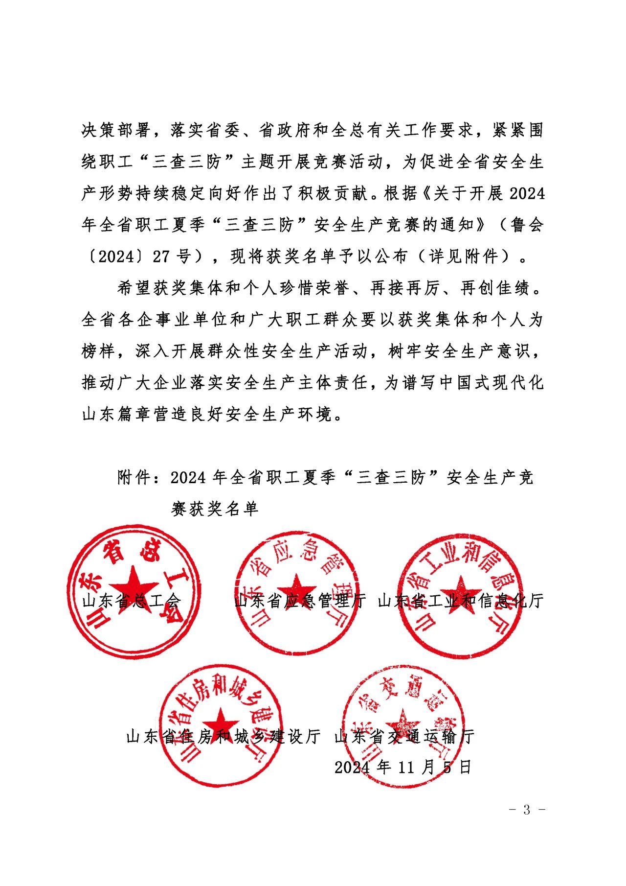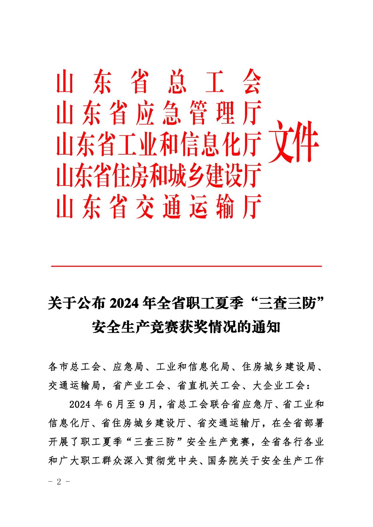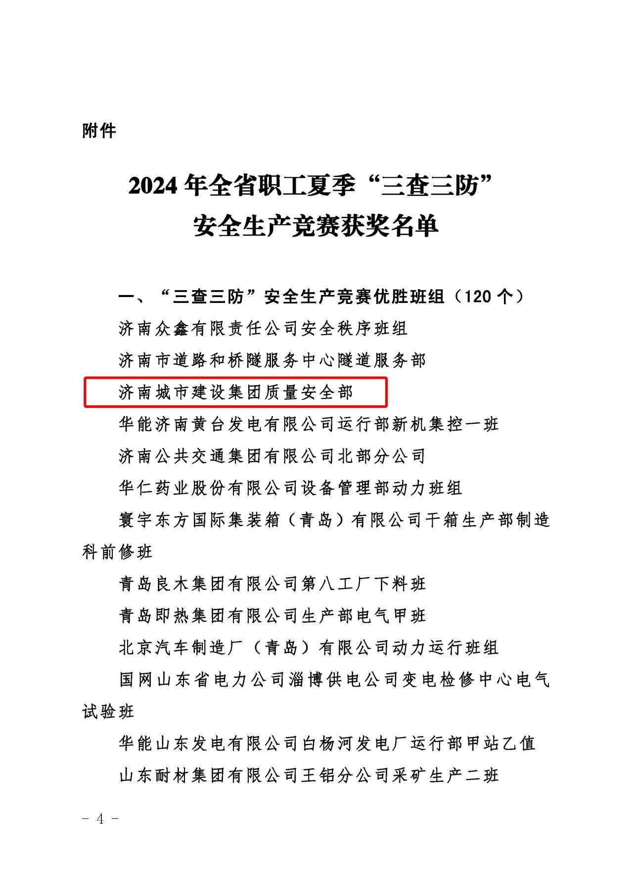 近日,山東省總工會(huì)、山東省應(yīng)急管理廳、山東省工業(yè)和信息化廳、山東省住房和城鄉(xiāng)建設(shè)廳、山東省交通運(yùn)輸廳聯(lián)合發(fā)布了《關(guān)于公布2024年全省職工夏季“三查三防”安全生產(chǎn)競(jìng)賽獲獎(jiǎng)情況的通知》,濟(jì)南城市建設(shè)集團(tuán)質(zhì)量安全部積極響應(yīng)上級(jí)主管部門(mén)的號(hào)召,按照集團(tuán)黨委的科學(xué)部署,全面而深入地開(kāi)展了各項(xiàng)安全專(zhuān)題活動(dòng),榮獲“三查三防”安全生產(chǎn)競(jìng)賽優(yōu)勝班組榮譽(yù)稱(chēng)號(hào)。